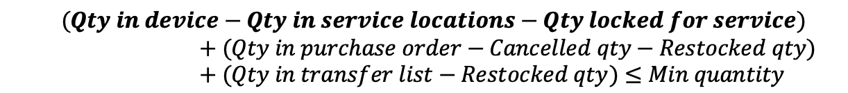 Rule is fulfilled when available quantity of durable item in device is at or below min in stock quantity. Durable items in any condition (excluding items needing service) are considered as available. Quantity ordered is determined to obtain items to reach min in stock quantity.