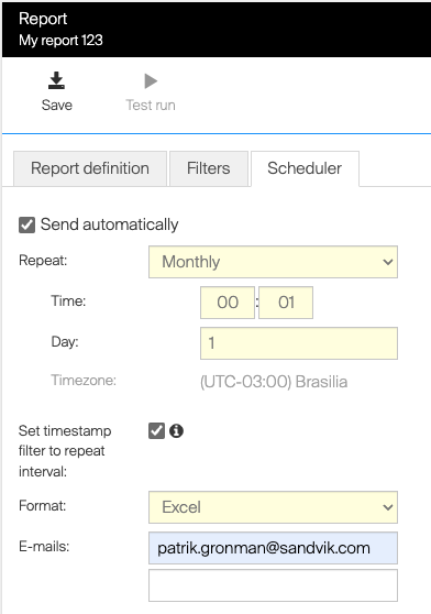 For report and scheduling report to be sent we have now implemented function to be able to send reports regularly with dynamically added date/time filters.