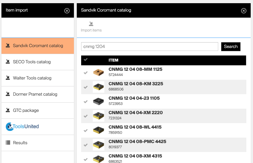 | Rework Sandvik Coromant catalog | Sandvik Coromant catalog is reworked to allow searching of items. The catalog now provides the same look and feel as other item catalogs. | Improvement |