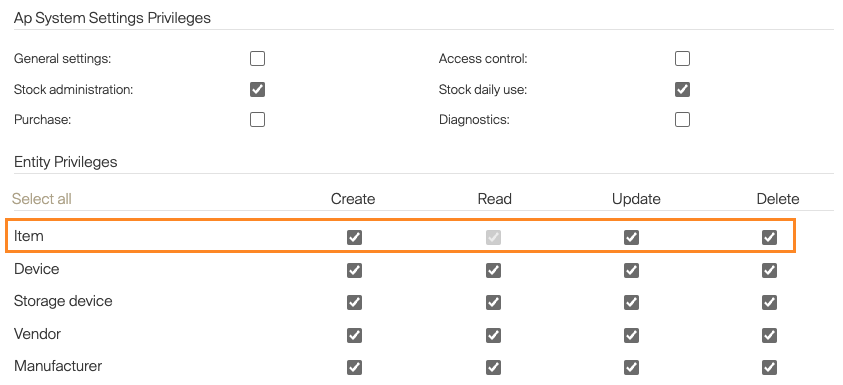 | Save and create new option on item leads copy of device assignments | When ‘Save and create new’ option on item detail is pressed and the new item is saved, this item will have device assignments copied from the item where this option was pressed. |