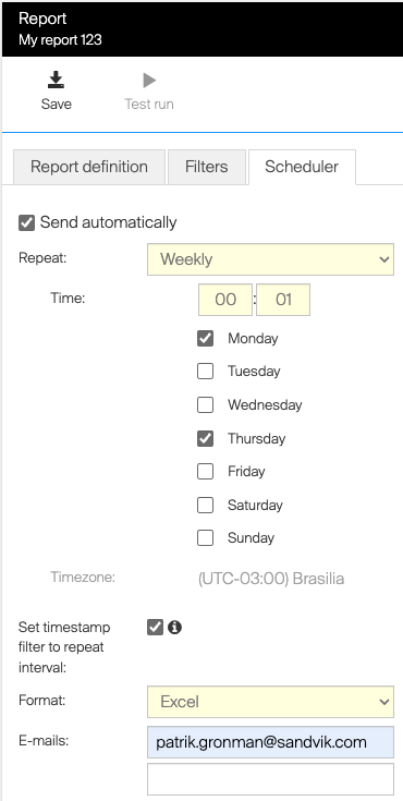For report and scheduling report to be sent we have now implemented function to be able to send reports regularly with dynamically added date/time filters.