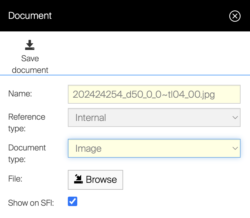 By clicking the document icon on SFI, a list of all available item documents are shown to the user. Remember that the option “Show on SFI” must be selected. These documents can then be opened in a full screen window by choosing wished row.
