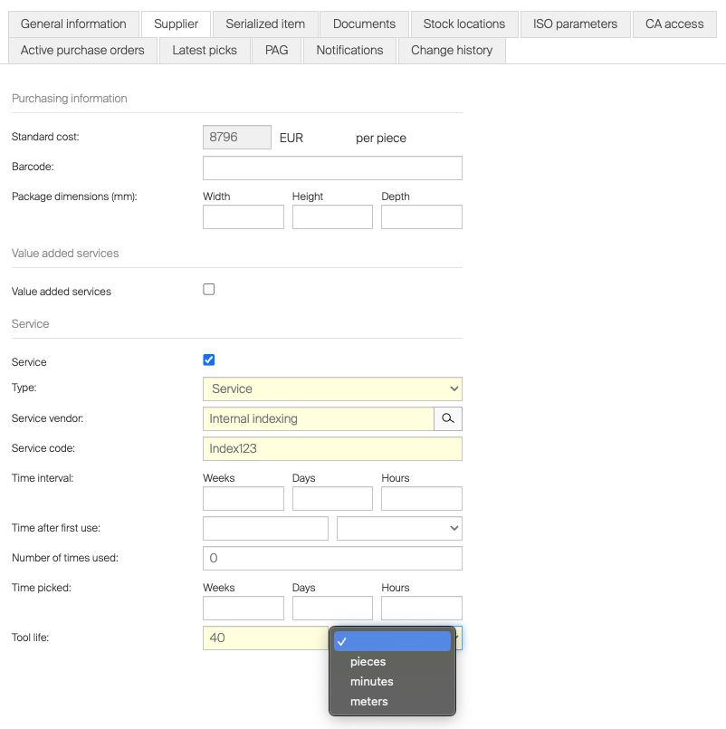 When the basic settings is made you also need to set-up the service process, (What needs to be done when item reach end of life) like send for internal indexing service. On the Supplier item tab settings you need to specify the metrics like tool life last 40 pieces or minutes (in cut) or meters (in cut) this is usually output that machines can deliver to operators.