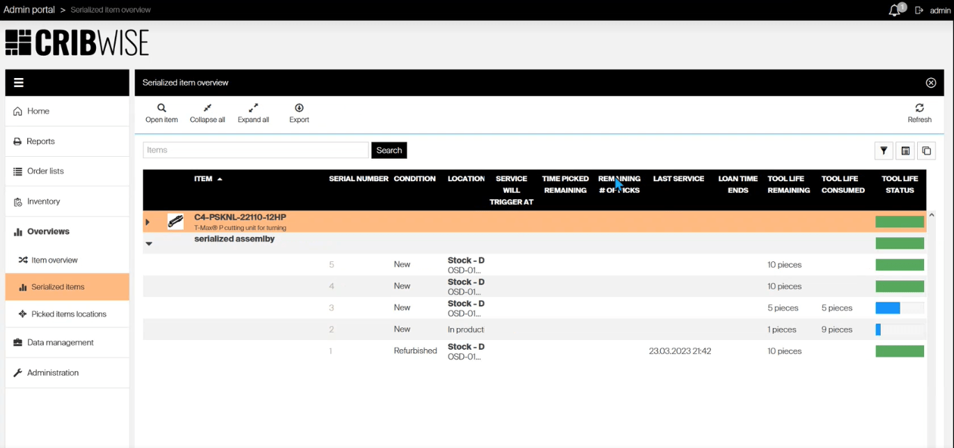 In the serialized items overview 3 new columns have been added, Tool Life remaining, Tool Life consumed, and a graphical bar remaining tool life.