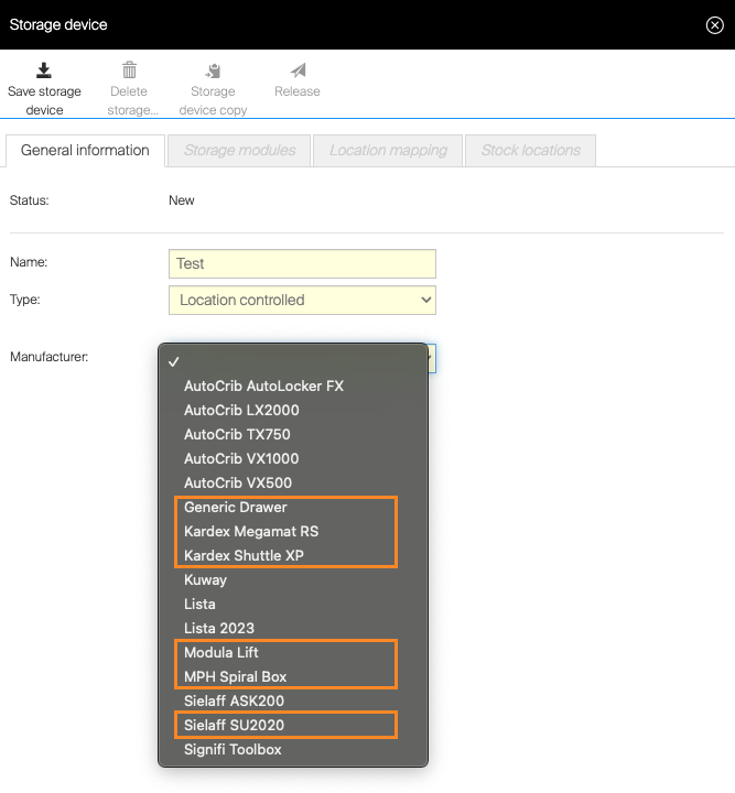 | Support for Modula Lift system | Added support to operate Modula Lift storage system. | New |