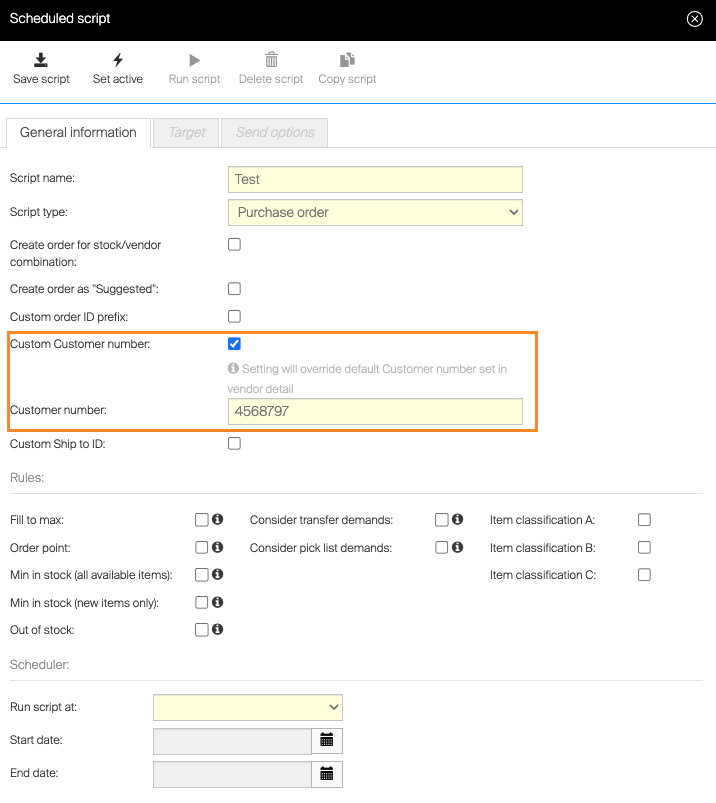 To solve this challenge we have now made it possible to override the customer number placed in the B2B order on script level. When making this override make sure that script have filters set in Target tab to only create order for that specific vendor and Stock/device combination, if this is not done all orders generated by this script to all vendors will get specified customer number!