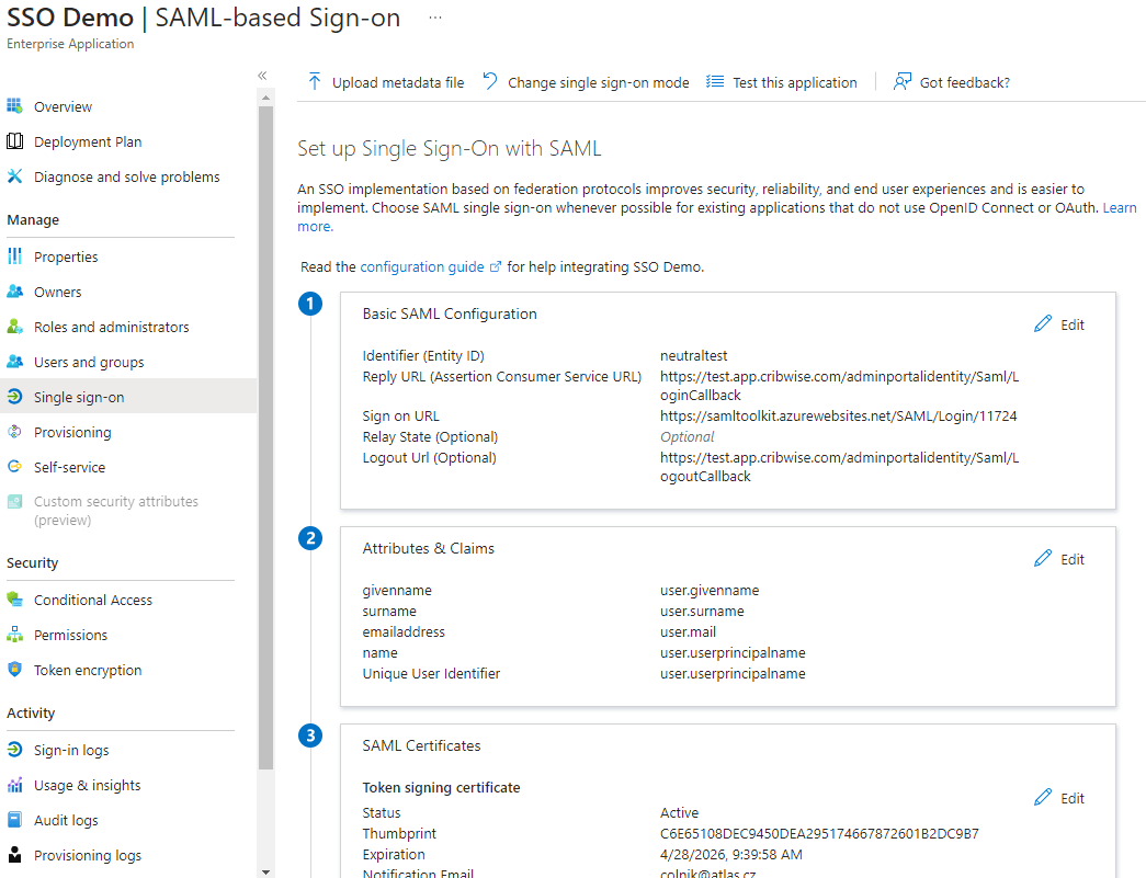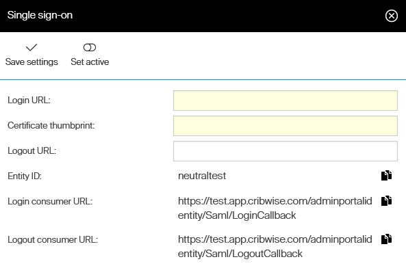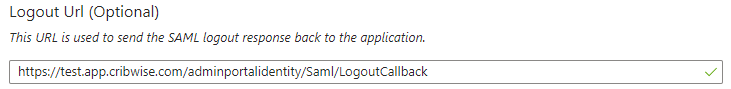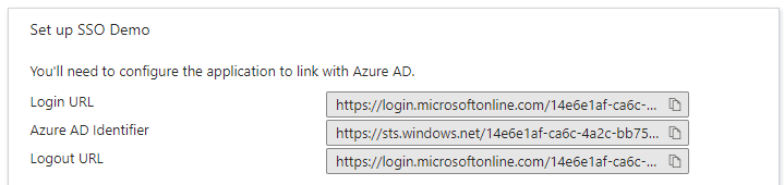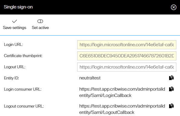 Setup of Azure AD is done. Navigate back to Admin Portal to SSO setup page. Set Login URL to value of Login URL taken from the AD. Set Certificate thumbprint to value of Thumbprint taken from the AD. Set Logout URL to value of Logout URL taken from the AD.