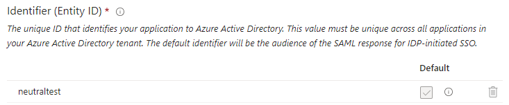 Select to edit Basic SAML Configuration. Set Identifier (Entity ID) to value of Entity ID field, taken from Admin Portal.