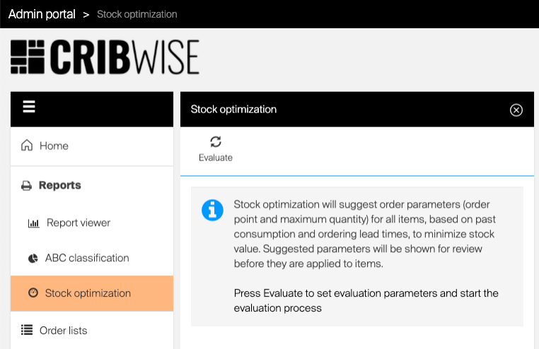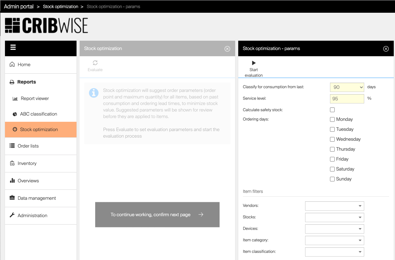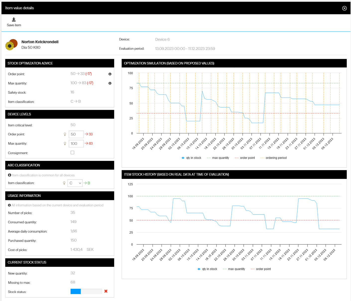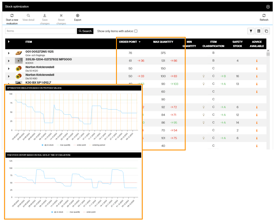 Set the values you have on order scripts for the item selection you would like to optimize The optimizer propose updates on order parameters (Order point and Max) that you can accept, accept with correction or decline! Before approval you can also see the simulation of new levels based on historical consumption.