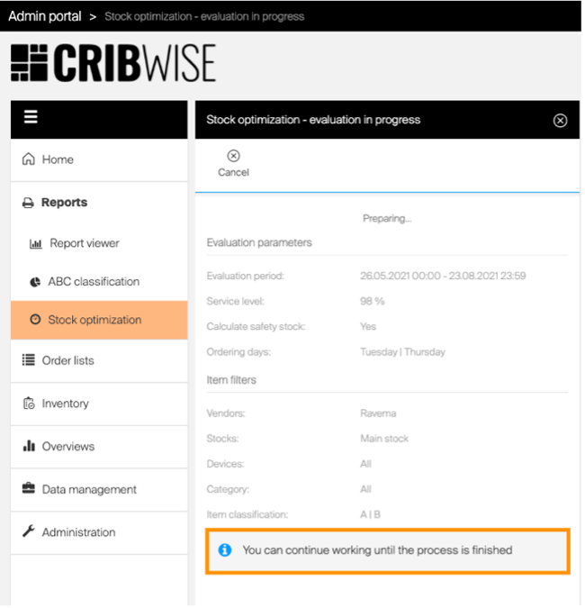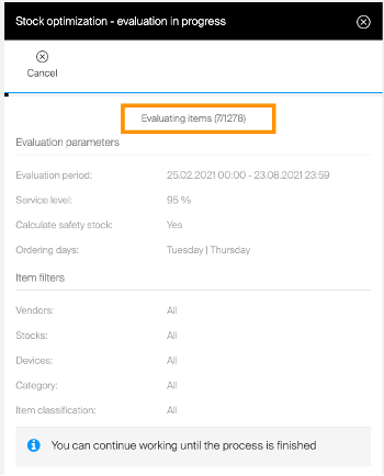 When you made your settings, you press “start evaluation” and the optimization starts. Pending on how many items that will be picked-up for analyze the evaluation can take time you can continue to work in the application and return later! Going back to the Stock optimizer menu you will see the evaluation status.