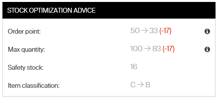 In the detail, any advice on the item is shown in Stock optimization advice section.