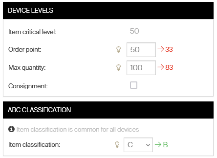 Any change proposed for ordering parameters is shown next to the parameter. To update the parameter, you can change its value or click the bulb icon to fill the proposed value automatically. Any change must be saved afterwards.