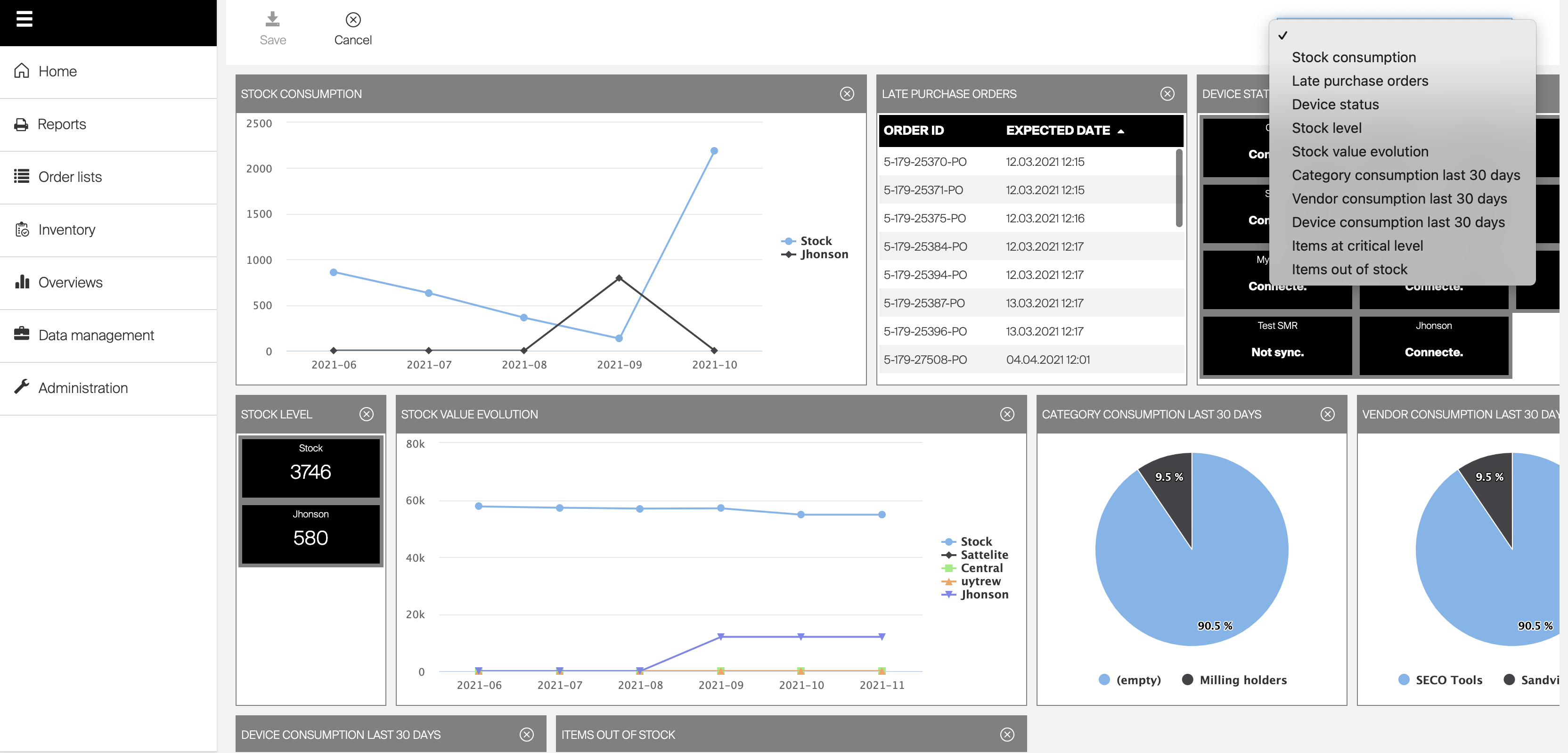 Then select widget from dropdown menu and confirm selection to add it to dashboard. If widget is already placed on the dashboard, existing widget is highlighted. To save changes and exit edit mode, press Save (