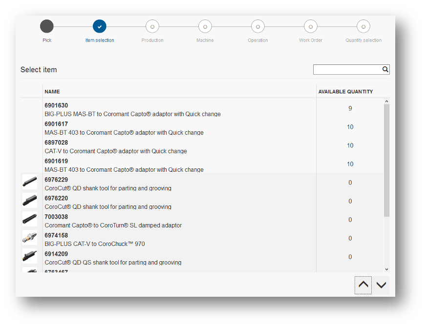 Main application area contains all information about currently performed action or menu to start an action. For basic operations, like picking, returning and moving, this area is extended with graphical illustration of operation progress (shown below). This graphical flow can be used to navigate between performed steps.
