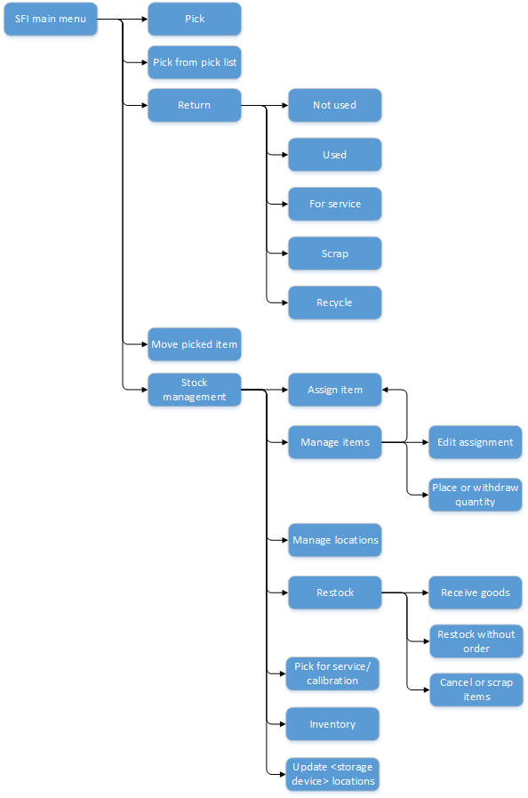 Below it is displayed the structure of SFI application menus and illustrate, how each operation can be accessed.