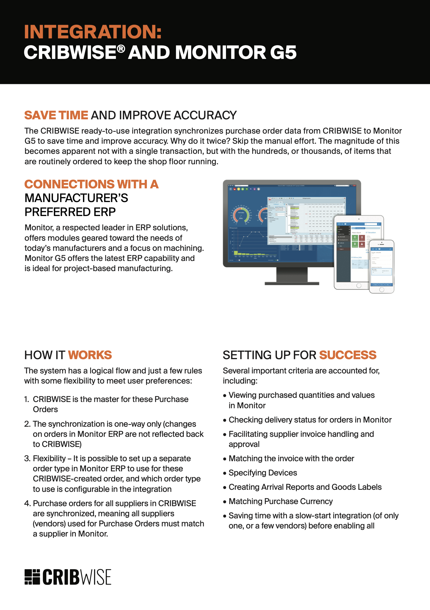 The CRIBWISE® ready-to-use integration synchronizes purchase order data from CRIBWISE® to Monitor G5 to save time and improve accuracy. Why do it twice? Skip the manual effort. The magnitude of this becomes apparent not with a single transaction, but with the hundreds, or thousands, of items that are routinely ordered to keep the shop floor running.